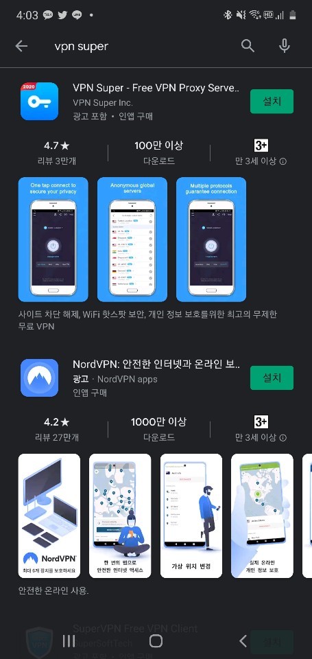 1. 먼저 구글플레이 스토어, 또는 앱스토어에서 'VPN Super'라고 입력합시다.