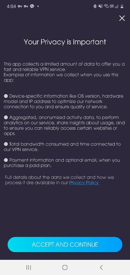 3. ACCEPT AND CONTINUE를 눌러 사용에 동의합니다.