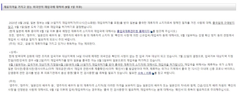 9월 1일부터 일본 체류자격 비자를 소지한 사람은 입국이 가능한 것으로 규제가 일부 완화되었다.